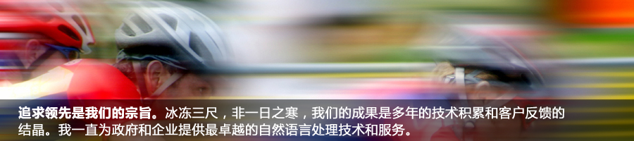 自從成立以來,我們?yōu)榭蛻籼峁└咝Ш椭悄芑男畔⑻幚砉ぞ吆妥稍兎铡T谶@個信息爆炸的時代,如何讓互聯(lián)網(wǎng)上和企業(yè)內(nèi)部的海量信息為我們帶來更多的價值需要高度智能化的信息處理工具。我們提供的技術(shù)能夠高效并且準確的對大量文本信息進行處理、檢索、挖掘、翻譯等工作,并可方便地與信息系統(tǒng)的其他模塊進行整合。